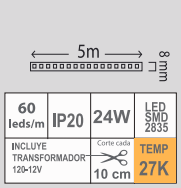 TIRA LED 24W 27K IP20 SMD-2835 120V 5M