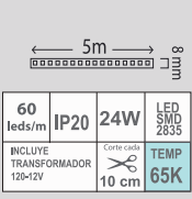 TIRA LED 24W 65K IP20 SMD-2835 120V 5M