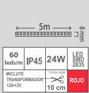 TIRA LED 24W ROJO IP45 SMD-2835 120V 5M